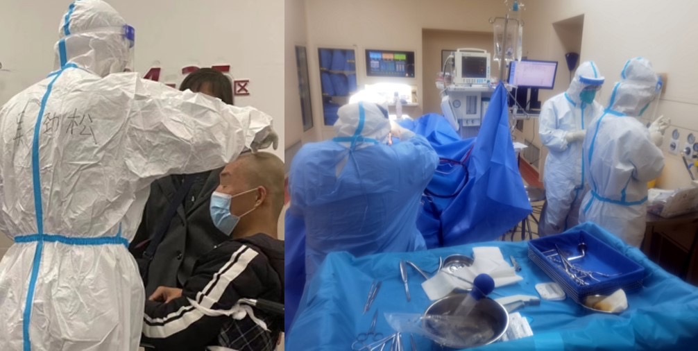 華山醫院寶山院區(定點醫院)普外科醫生們為新冠陽性患者正在開展緊急手術。