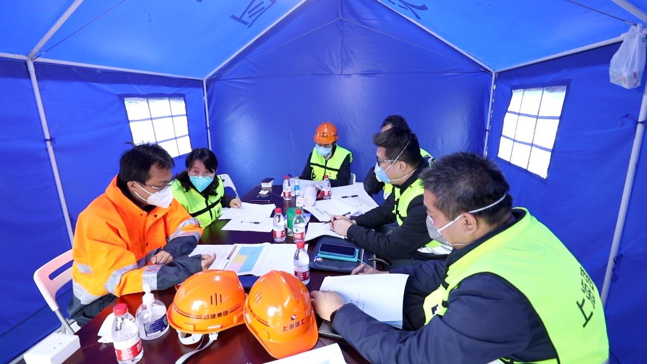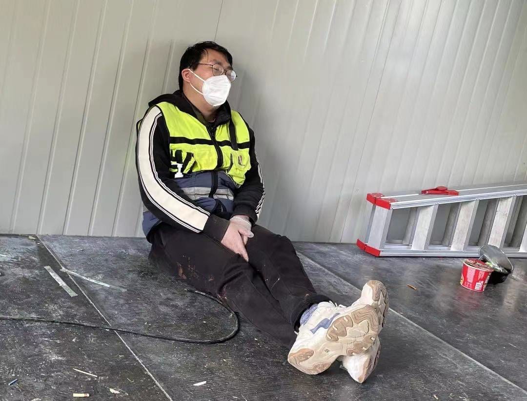 “3月底的上海,還有點冷,沒有被子蓋,我們就裹著衣服,每天只能睡不超過兩小時!鄙虾=üぜ瘓F副總工程師王美華是施工現場為數不多的女性,F場24小時不停工,工人兩班倒,交班后就地鋪板睡覺,但應急指揮部管理人員要隨時待命,解決現場各類問題,只能找間隙蜷縮在車里休息一下。