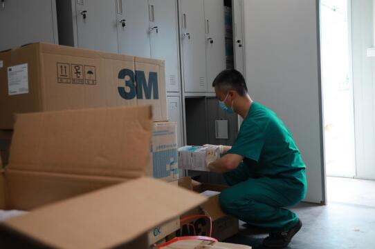 開艙前黃一樂正在一更區擺放防護物資