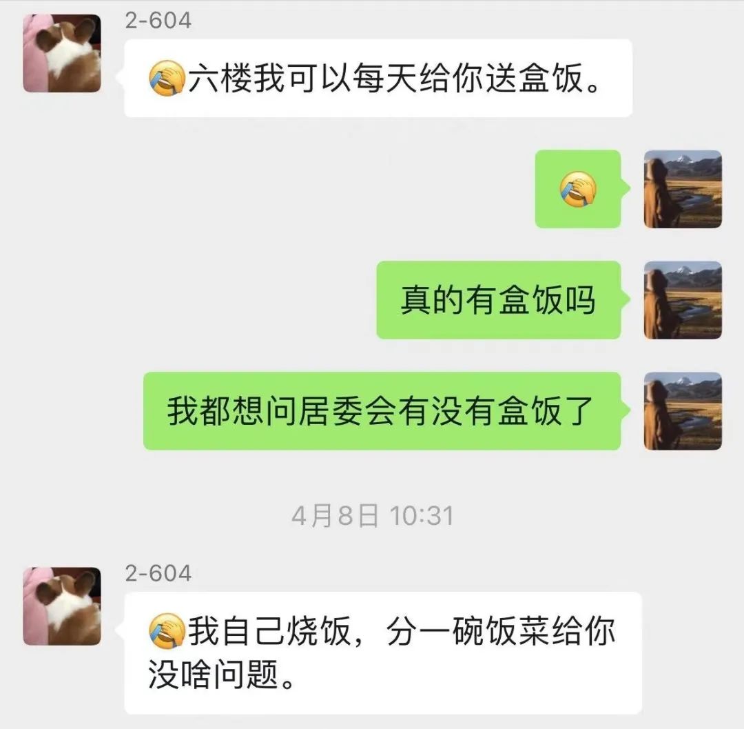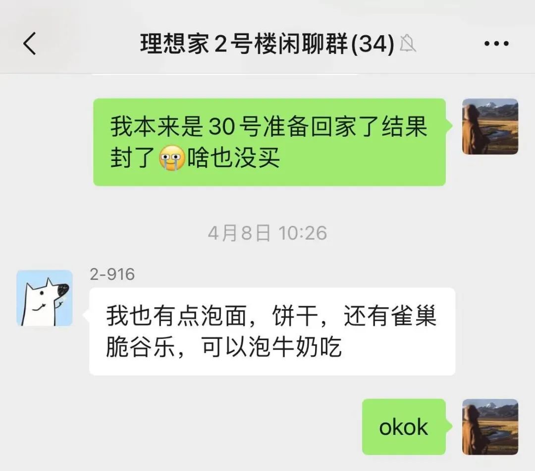 “剛封控的時候,心態是很崩潰的!辈贿^,在父母和鄰居的鼓勵下,18歲的小周很快振作起來!拔以诜饪厍皼]有準備足夠的食物,只好在小區的居民群里求助!