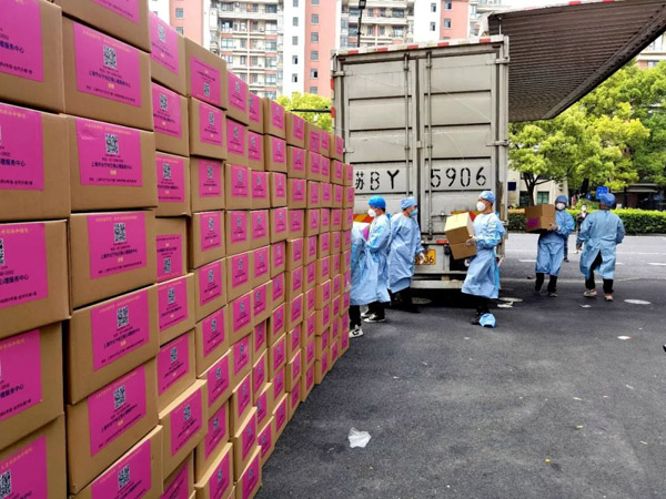 4月19日早上8:00,一輛來自安徽馬鞍山、裝載了1200箱超10噸生活物資的集卡停在了周家橋街道辦事處門前。卸貨、配送,短短數小時,這批物資就被送到了21個居民區的獨居純老家中。