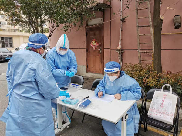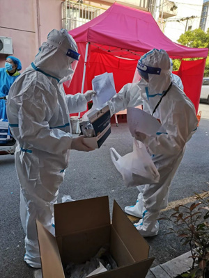 4月9日,小區全員需完成抗原自測。老黨員志愿者凌晨5點就開始包攬抗原試劑拆箱分裝工作,整整2小時不間斷,完成了125戶居民400多份抗原試劑的分裝。隨后,小余、小潘、小戴、小謝等青年黨員志愿者充分發揮黨員先鋒模范作用,及時接過“接力棒”,僅用半小時就完成整小區分發,達成了早上8點出抗原自測結果的目標。各樓棟內的志愿者也時刻準備,如“夫妻檔”志愿者顧銘艷和張紹文,遇到不會自己測抗原的高齡、獨居老人時,會耐心指導老人操作。