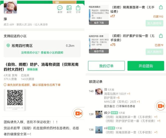 疫情防控到了最吃勁的階段,社區防護物資消耗量大。為了給一線人員提供更加堅實的安全保障,4月13日,小區112號樓的@萍自告奮勇當上"團長",116號樓的@紫雨zhai作為總策劃,108號樓的@韓韓負責聯系購買渠道,迅速開起一個防護物資捐贈、自購團,居民們捐贈熱情高漲,短短一天的時間,就接到140份訂單。