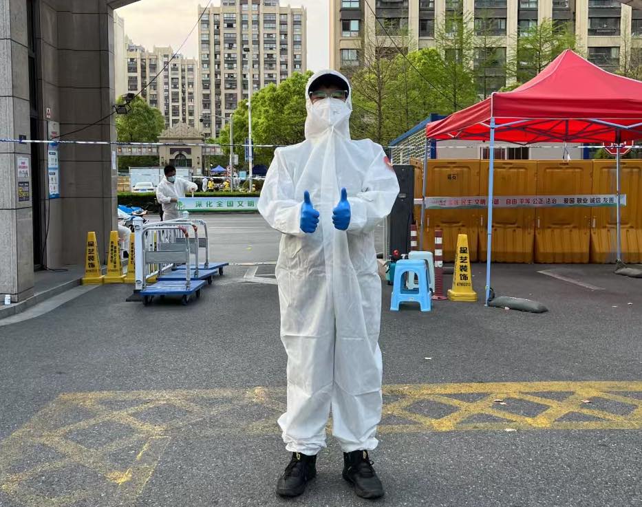 陳秀濤是上海工程技術大學大一的學生,4月1日起,便開始在海趣居民區做志愿者,參與維持秩序、發放抗原檢測試劑、小區巡邏、掃碼等志愿服務。