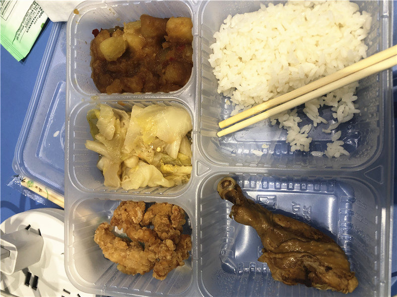 下午醫護過來測體溫。19:00晚飯準時送到,晚上和中午不重樣,營養均衡,還不錯。