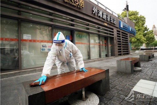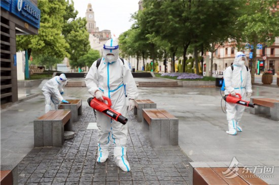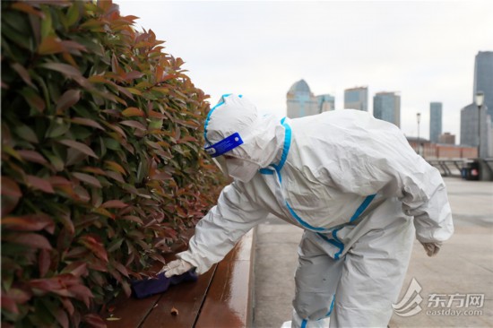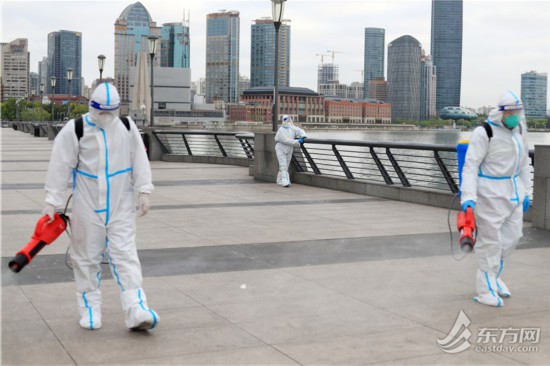 清晨六點,黃浦城發集團下屬欣誼公司濱水區班組的環衛工人就已經在外灘忙開了。班組組長蘆偉告訴記者,環衛工人早上5點半就上班了,沿著外灘從外白渡橋到東門路約2.6公里的范圍內,先做一遍保潔,到7點左右環衛工人們休息片刻,吃早飯,然后再進行消殺。