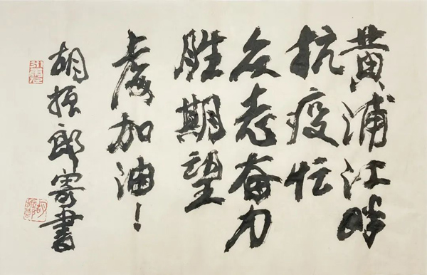 盡管疫情暫時阻斷了胡振郎的“返鄉”之途,但這位老藝術家時刻惦記著普陀,也通過新聞報道、畫院成員的書畫作品了解疫情動態。在與區檔案局溝通交流后,雙方最終決定并策劃了本次《抗疫之藝》書畫展,希望借此發動“廣大藝術家以不同的藝術形式表達著各自的心聲”,共同期待上海早日“清零”、恢復如常。(來源:上海普陀)