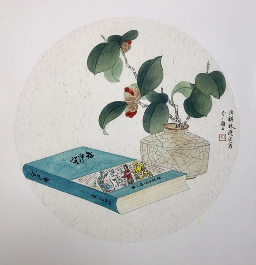 林捷告訴記者,在近期的閱讀過程中,一本記載著2020年上!皯鹨摺笔论E的《守滬者》令他印象深刻,書中的故事與眼前的場景重疊交錯,激發他用自己擅長的工筆畫創作了一幅同名作品。畫上,一本《守滬者》合頁于案,旁有兩枝茶花含苞待放。