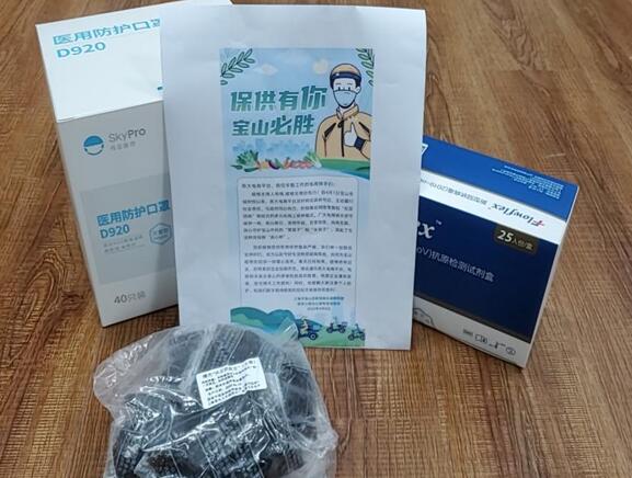 張偉偉及各站點配送小哥收到來自寶山區政府的防疫愛心大禮包,里面有口罩、中藥包、抗原試劑等,幫助配送小哥做好防護、增強體質。