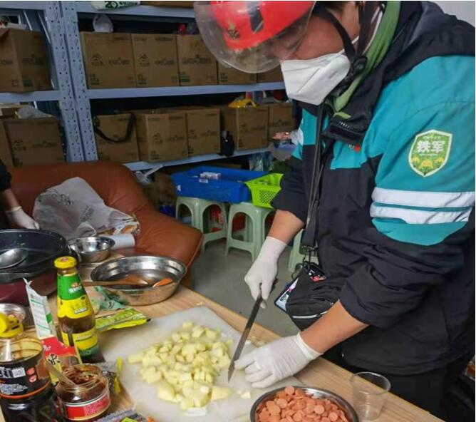 除了住宿問題得到解決后,就餐問題也是大家比較關心的,張偉偉透露,疫情之前,配送小哥有囤一些方便速食,同時公司提供餐費補貼,會調撥一些餐飲食品,有些站點的站長還會充當“廚師”,親自下廚給配送小哥炒菜做飯。張偉偉表示,配送小哥的吃住雖然和疫情之前不能比,但是基本要求能夠滿足。