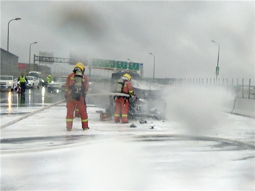 閔行區北翟路高架上發生一起車輛火災,特勤支隊參戰力量迅速到場,使用水槍持續出水滅火,成功撲滅火勢。