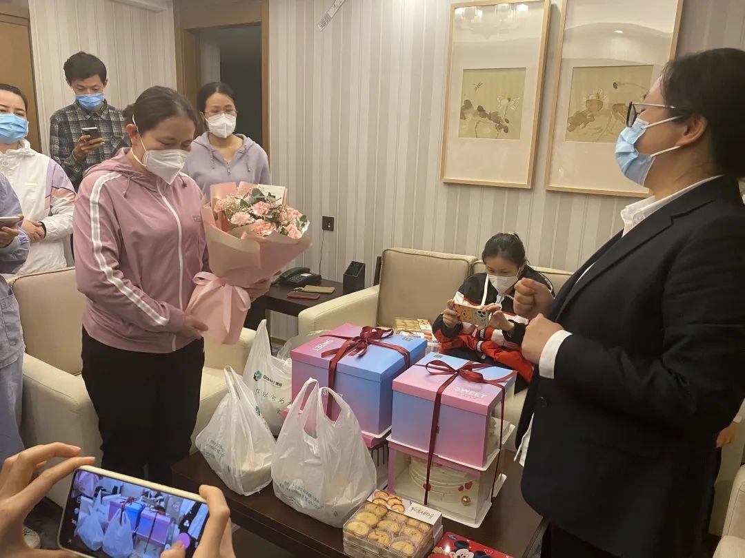 4月21日,得知當天正是廣西援滬醫療隊隊員的生日,賓館工作人員貼心地為隊員送上鮮花和長壽面,表達對他們的感謝和祝福。