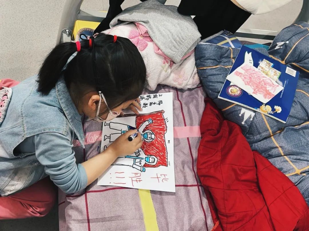 據悉,這些書籍和繪畫工具,都是楊浦區中心醫院的工作人員從醫院兒科搬運過來的,經紫外線消毒后轉運進艙,最終送到小朋友們的手中。
