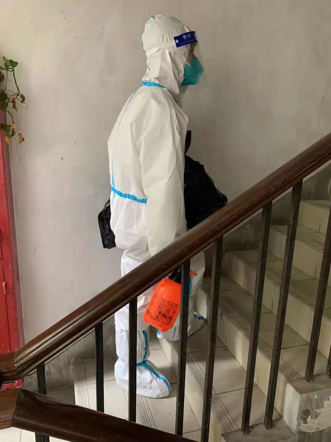 上午10點,在廣中路街道一小區的封控樓內,一位“大白”進入樓道并大聲吆喝著。他一邊吆喝一邊走到頂層,開始往下逐層收取垃圾。