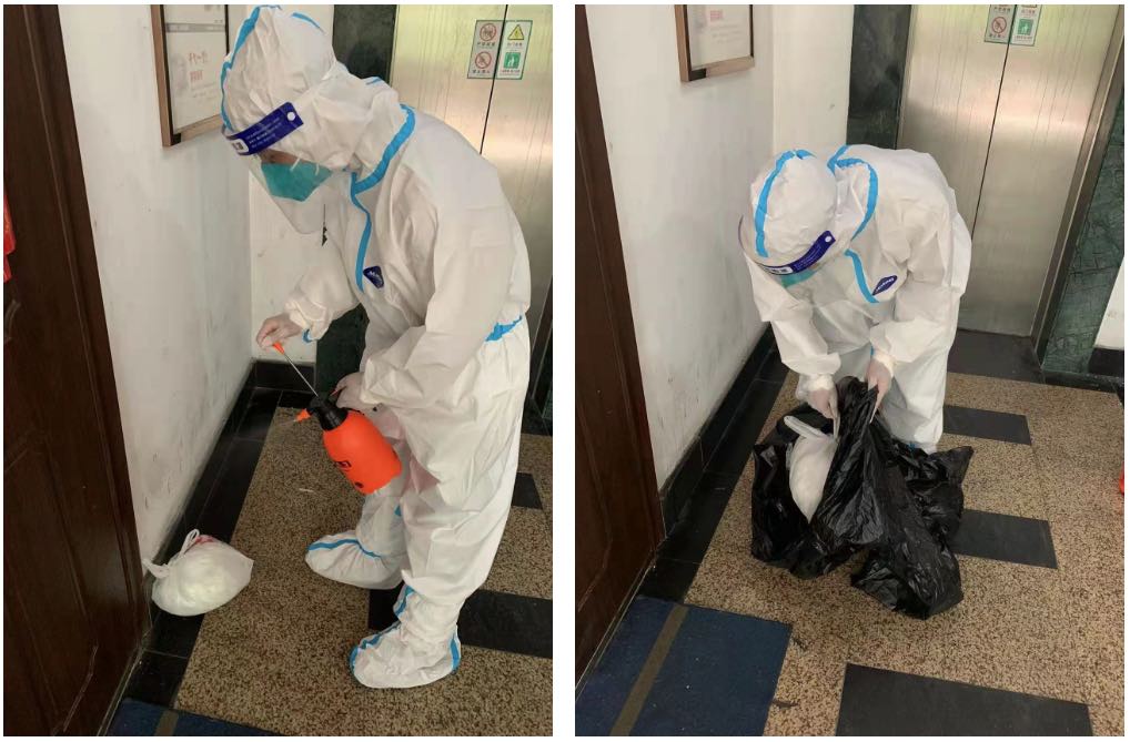 在一戶居民家門口,“大白”對居民已提前放置在此的垃圾進行消殺。在對垃圾仔細噴灑消毒水后,他把垃圾裝入黑色垃圾袋并封口,緊接著,又對垃圾袋表面再次消毒。就這樣逐層逐戶處理,“大白”完成了對這幢6層封控樓的垃圾清收工作。