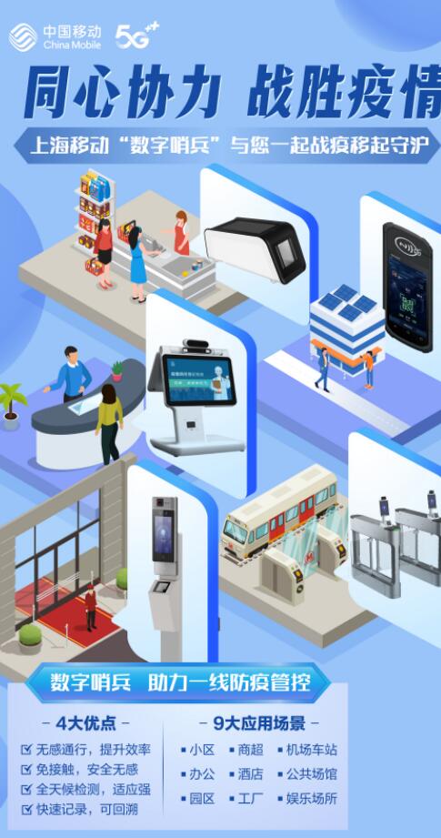 上海市政府決定自4月5日起,在全市推行“場所碼”、“健康核驗一體機(數字哨兵)” 掃碼通行措施,為推動數字化賦能防疫工作,上海移動提供“數字哨兵”服務,協助企業解決員工健康檢測和安全通行。通行人員只需站在指定位置進行人臉識別和測溫,同時將隨申碼靠近掃碼處,或將身份證放置于機器上進行識別,基于上海大數據中心和健康云平臺大數據支持,可快速核驗健康碼、核酸檢測結果、新冠疫苗接種以及最新抗原結果情況。當前,在全市范圍內已有數百臺上海移動 “數字哨兵”陸續上崗,為企業守好防疫大門。
