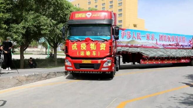 滬莎人民一家親,團結抗疫展真情?κ驳貐^各級黨政機關和全地區各族人民也始終心系上?挂吖ぷ,積極開展物資捐贈幫助上海共同抗疫。在上海援疆前指的積極協調下,喀什地委行署、喀什地區伽師縣、塔什庫爾干縣和南達新農業股份有限公司、新疆妙仁醫療用品有限公司等單位共向浦東新區捐贈食品、消毒液、隔離服等抗疫物資,共計194.35噸、價值470余萬元。
