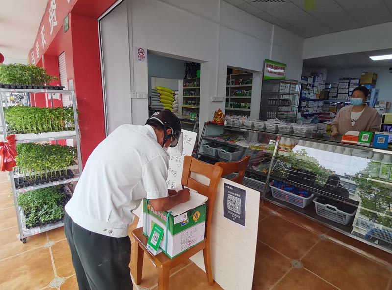 不僅菜苗供應要有保障,疫情防控更要有序。從貨運車的消殺,到店員的一天2次核酸或抗原檢測,到顧客的掃碼登記,再到店面的定時消毒……為此,呂巷鎮全程跟蹤監督,每天有專人線上詢問需求,核查核酸報告、抗原記錄,三天一次上門對消毒設施、防疫措施進行實地檢查。了解到店員人手不夠后,營業第一天的時候還安排了兩位志愿者駐扎協助。