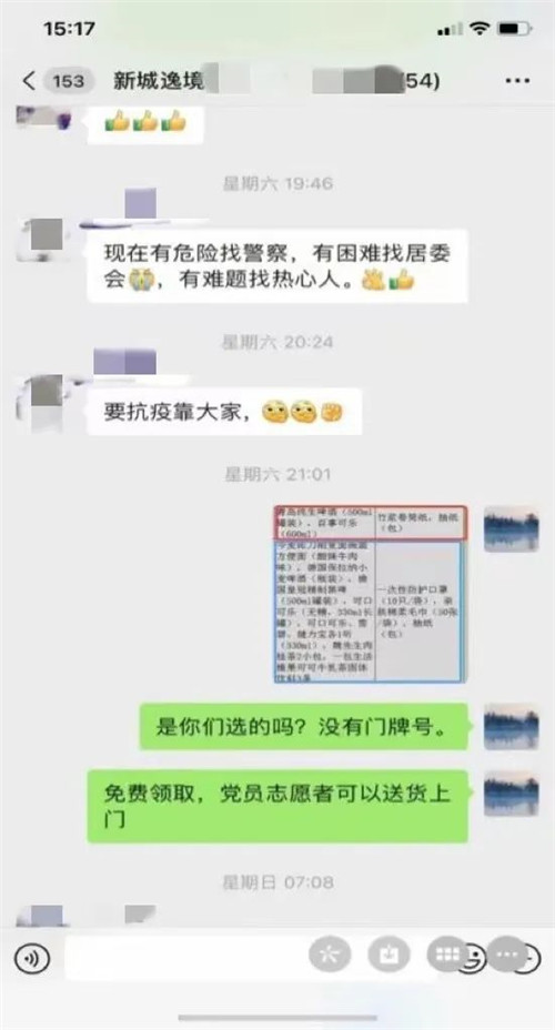 短短幾個小時,大家紛紛認領了大米、油、白糖、鹽、垃圾袋等各種生活用品。認領完畢后,黨員們又根據分配到戶的《黨員物資認領清單》,將消毒過的物品送到了居民家中。據居委會書記王燕反饋,很多居民都表示,十分感激送來物資的鄰居,等疫情散去了一定要當面感謝。也正如樓道群里這位居民的留言,“現在有危險找警察,有困難找居委會,有難題找身邊熱心人!笔前!封控之下,遠親不如近鄰。
