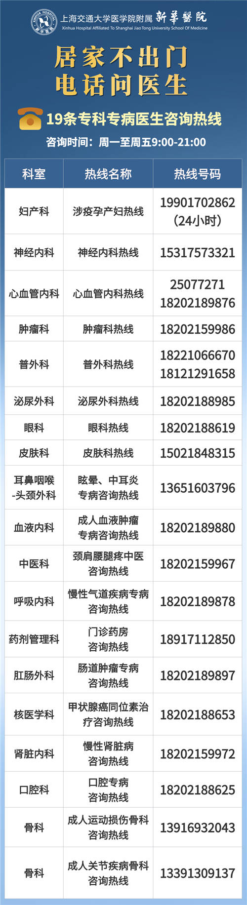 目前,新華醫院推出的?茖2♂t師咨詢熱線共有19條,熱線的服務時間為周一至周五的早上9點到晚上九點。新華醫院醫務部、門急診部負責人盛旭俊說:“這些熱線是不斷梳理門急診患者需求而動態調整的,一部分是當前老百姓關注度高需求量大的專業,另一部分是新華醫院的特色?!