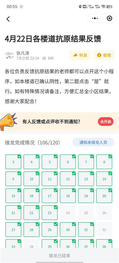 他依托微信小程序,成功生成抗原結果統計反饋表、創立樓棟號、完成情況和異常情況備注。每次小區做抗原自測,他在群內預先發布小程序,還會加上當日的天氣情況,成為了一名“有溫度”的實力派群主。