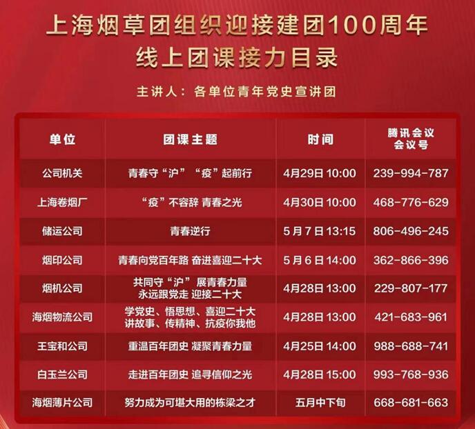 上海煙草團委按照“組織化學習、群眾性宣講”的要求,集中組織各級團組織開展了“網絡特別主題團日”,由本單位青年宣講團成員結合黨領導下的青年運動史、青年抗疫故事、經濟發展中的青年力量等,在線面向全體團員開展團課直播,各基層團組織通過“團課云接力”的形式,圍繞“疫”不容辭、重溫團史、信仰之光等9個主題,形成一套團課共享菜單。團員青年表示,在每場15分鐘的微視頻中,深深地致敬了每一段奮不顧身的青春歷程。