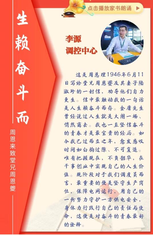 紅色家書是共產黨人初心如磐、英勇無畏的真實寫照。國家電網華東分部團委制作《紅色家書》讀本,供所有青年學習感悟,并組織團員青年以誦讀革命家書的形式,賡續紅色血脈、凝聚青春力量。精選了十余篇飽含深情的誦讀優秀作品和豐富深刻學習體會,分上下兩期在線展示,以此號召電業青年以熱血之姿和奮發斗志,守“滬”萬家燈火,共待春和景明!