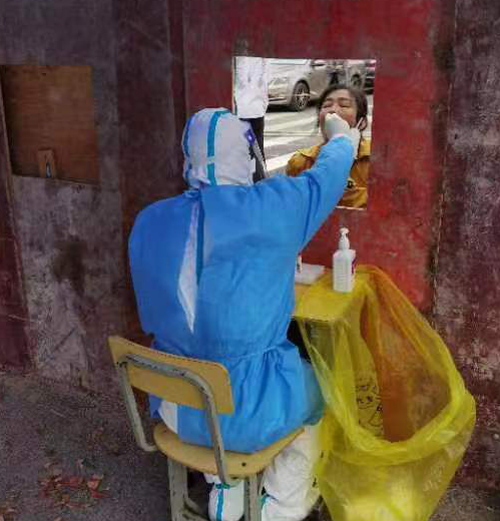 在現場可以看到,這個工地上的核酸檢測點是因地制宜改造而成。工地采樣點用木板隔離起來,中間開出一個30*50的小窗口,醫護人員通過這個小窗口完成采樣,減少醫護人員和工人的直接接觸。