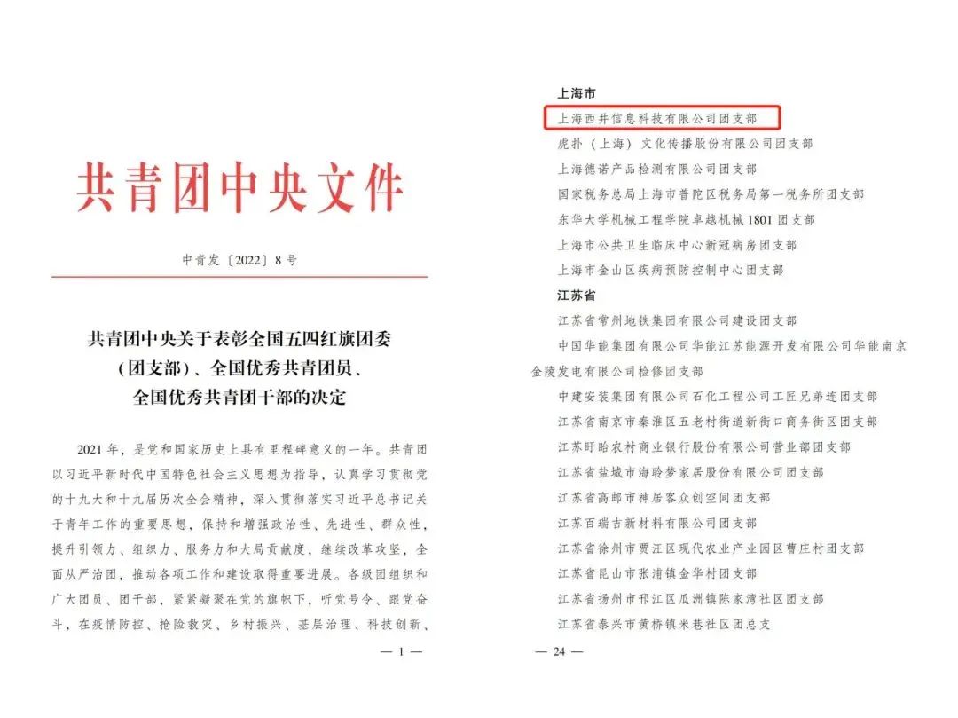 近日,共青團中央作出表彰決定,授予377個團組織全國五四紅旗團委(團支部)稱號。其中,長寧科技企業上海西井信息科技有限公司團支部榮獲“全國五四紅旗團支部”稱號。