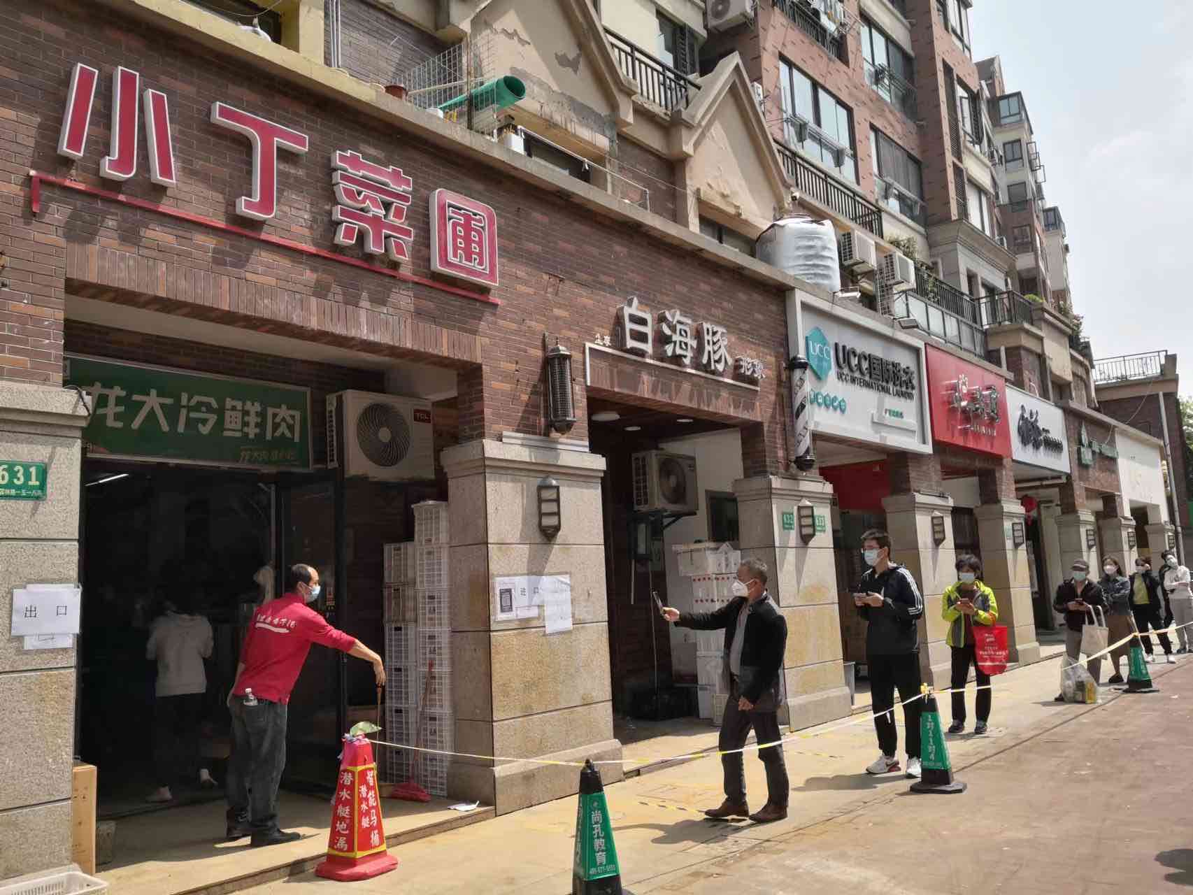更多的人是出去采購。外面兩排商業樓里,幾家小超市開了。每家超市前都拉起了軟隔離帶。小菜場前面排隊的人最多!伴g隔一米排隊,到商超門口要掃場所碼,里面人流不能超過5人”,顧亞香說,“場所碼的好處是,如果出現了‘陽’,可以快速知道哪些人來過,哪些人要隔離!