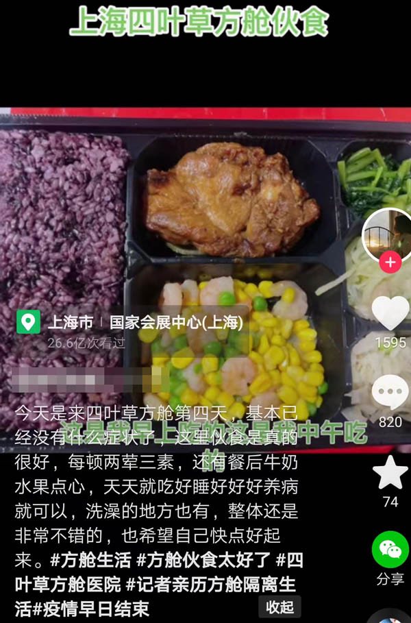 “住了十幾天,兩葷三素,還有點心,時不時來個水果夜宵,你慕了嗎?”有國展中心艙內人員在網上曬出了伙食。
