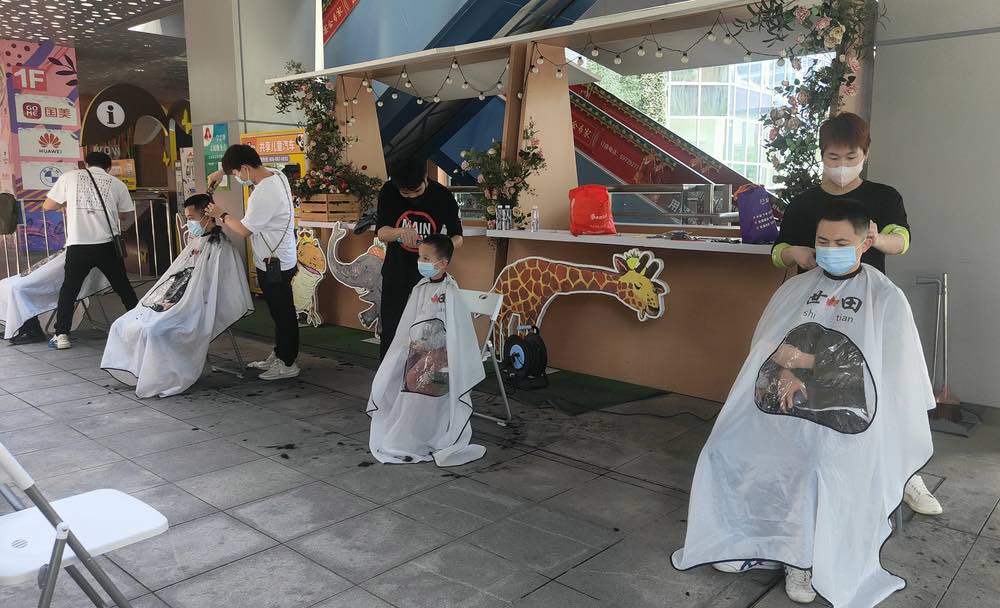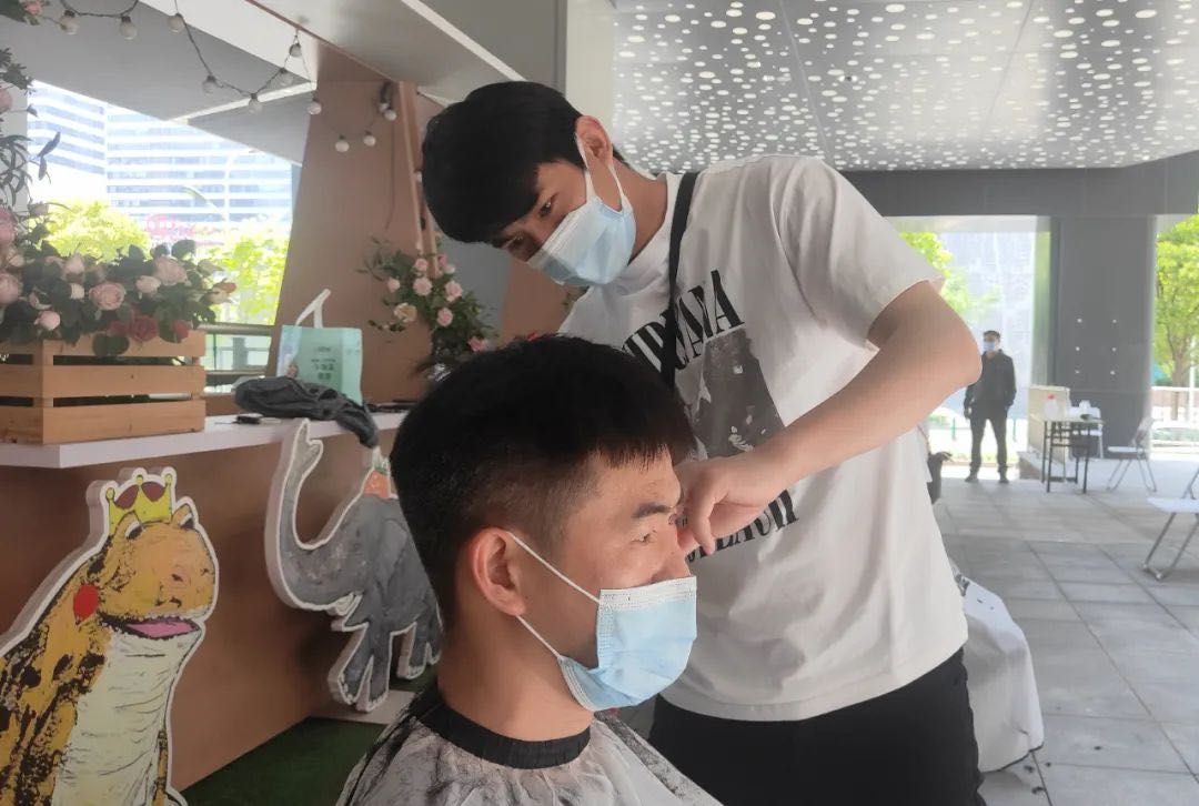 記者來到青浦區盈浦街道東渡蛙城,來自轄區內的一家理發店的理發師們佩戴口罩整裝待發準備為居民們免費剪發,聞訊前來的理發的市民已有不少。這次公益理發實行預約制,覆蓋范圍為東渡蛙城周邊三公里以內的居民。按號理發,雖然條件相對簡陋,但托尼老師們剪起來卻絲毫不含糊,不一會兒,就像變魔術一般讓封控在家許久未理發的市民換了個造型。