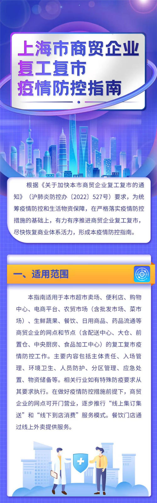 上海市將根據疫情防控需要和商貿企業復工復市實際情況,適時對商貿企業復工復市相關要求和疫情防控指南作動態調整。