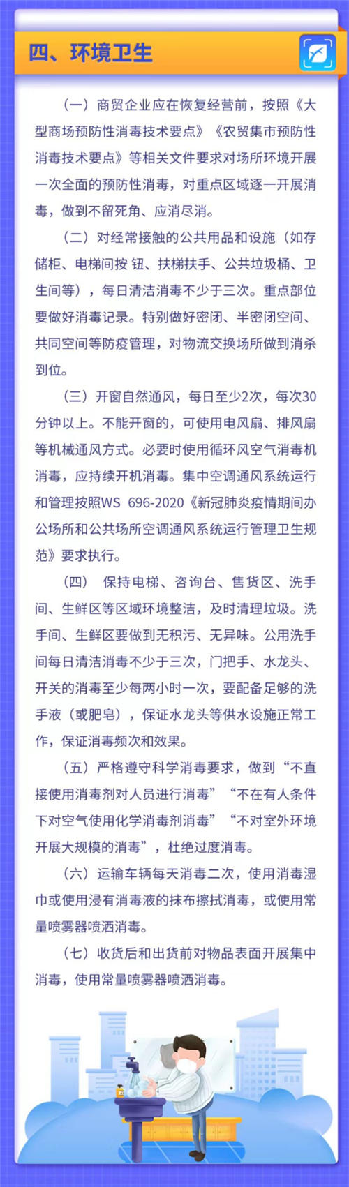 商貿企業應在恢復經營前,按照《大型商場預防性消毒技術要點》《農貿集市預防性消毒技術要點》等相關文件要求對場所環境開展一次全面的預防性消毒,對重點區域逐一開展消毒,做到不留死角、應消盡消;謴徒洜I后,對經常接觸的公共用品和設施(如存儲柜、電梯間按鈕、扶梯扶手、公共垃圾桶、衛生間等),每日清潔消毒不少于三次。重點部位要做好消毒記錄。特別做好密閉、半密閉空間、共同空間等防疫管理,對物流交換場所做到消殺到位。