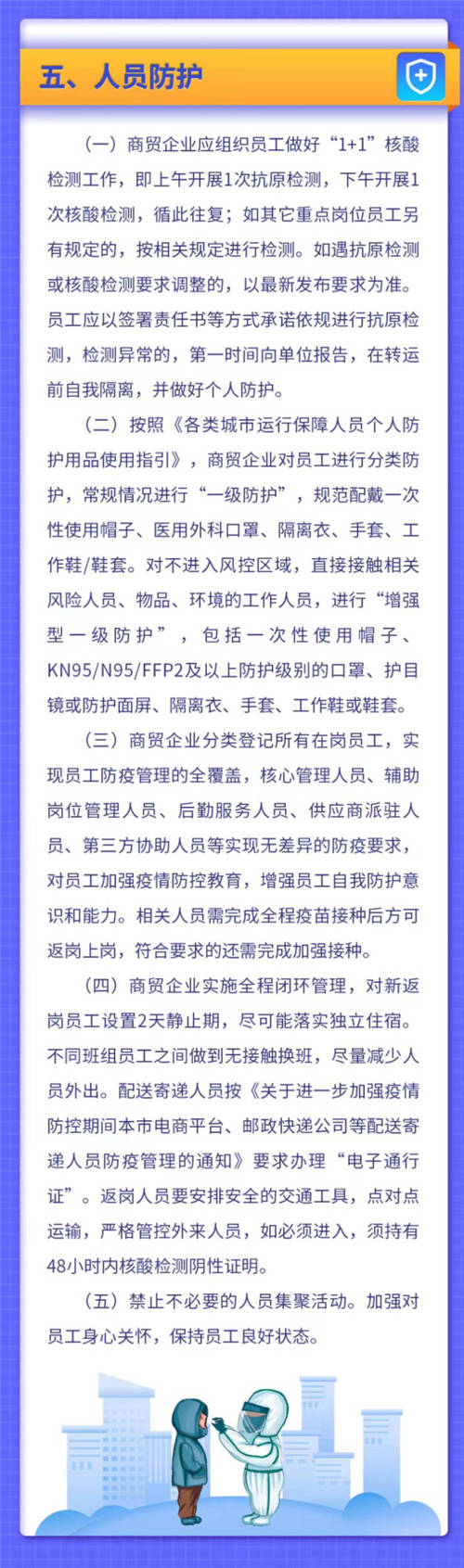按照《各類城市運行保障人員個人防護用品使用指引》,商貿企業對員工進行分類防護,常規情況進行“一級防護”,規范配戴一次性使用帽子、醫用外科口罩、隔離衣、手套、工作鞋/鞋套。對不進入風控區域,直接接觸相關風險人員、物品、環境的工作人員,進行“增強型一級防護”,包括一次性使用帽子、KN95/N95/FFP2及以上防護級別的口罩、護目鏡或防護面屏、隔離衣、手套、工作鞋或鞋套。