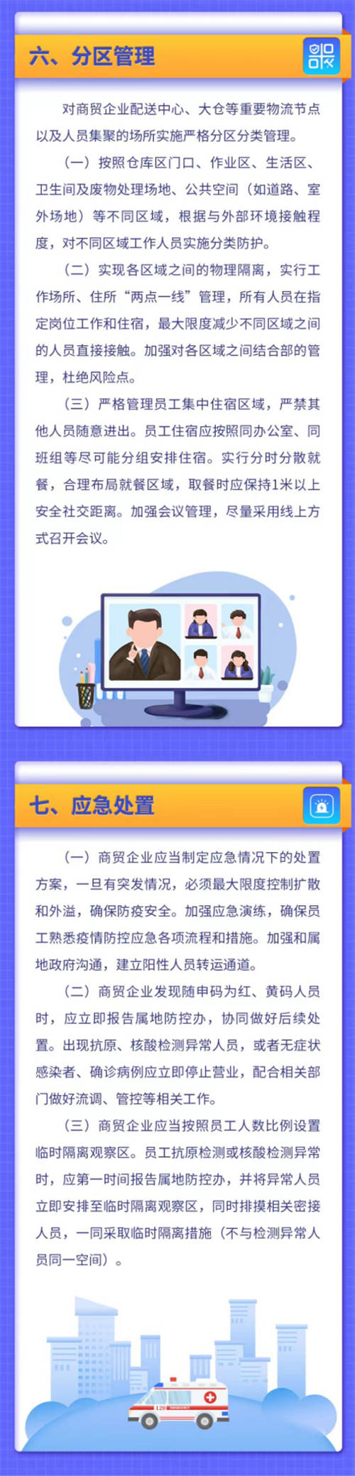 商貿企業應當制定應急情況下的處置方案,一旦有突發情況,必須最大限度控制擴散和外溢,確保防疫安全。商貿企業發現隨申碼為紅、黃碼人員時,應立即報告屬地防控辦,協同做好后續處置。出現抗原、核酸檢測異常人員,或者無癥狀感染者、確診病例應立即停止營業,配合相關部門做好流調、管控等相關工作。商貿企業應當按照員工人數比例設置臨時隔離觀察區。員工抗原檢測或核酸檢測異常時,應第一時間報告屬地防控辦,并將異常人員立即安排至臨時隔離觀察區,同時排摸相關密接人員,一同采取臨時隔離措施(不與檢測異常人員同一空間)。