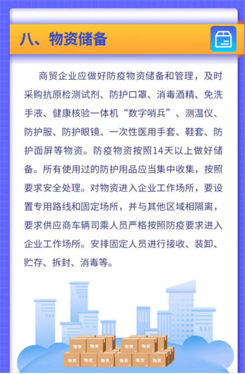 商貿企業應做好防疫物資儲備和管理,及時采購抗原檢測試劑、防護口罩、消毒酒精、免洗手液、健康核驗一體機“數字哨兵”、測溫儀、防護服、防護眼鏡、一次性醫用手套、鞋套、防護面屏等物資。防疫物資按照14天以上做好儲備。所有使用過的防護用品應當集中收集,按照要求安全處理。對物資進入企業工作場所,要設置專用路線和固定場所,并與其他區域相隔離,要求供應商車輛司乘人員嚴格按照防疫要求進入企業工作場所。安排固定人員進行接收、裝卸、貯存、拆封、消毒等。