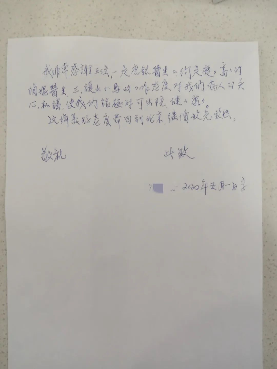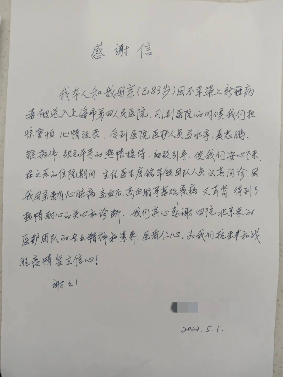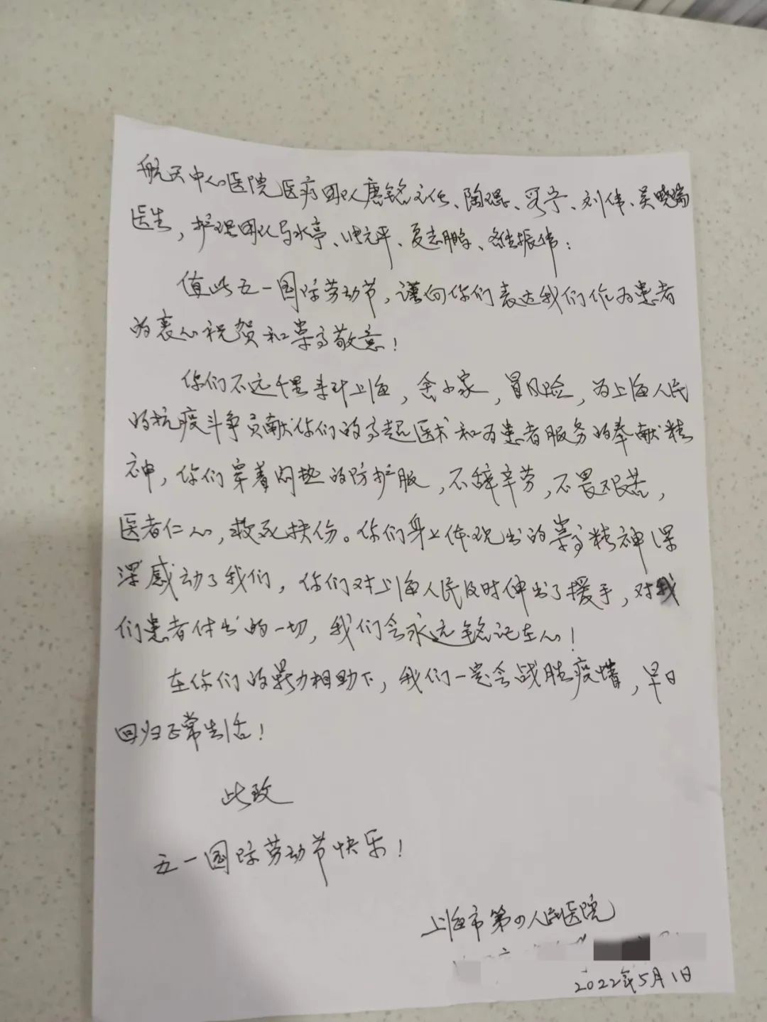 “謹向你們表達我們作為患者的衷心祝賀和崇高敬意!你們不遠千里來到上海,舍小家、冒風險,為上海人民的抗疫斗爭貢獻你們的高超醫術……”