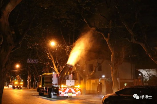 在重點區域,綠化部門加強與交警、電力、房管、街道等部門的聯動合作,采取物理“吹沖掃”的作業方式,將已成熟欲脫落的果毛,經人工干預提前吹落,再由水霧裹挾果毛沉降至地面,之后利用環衛車輛進行沖洗清掃,降低果毛飄絮的污染。