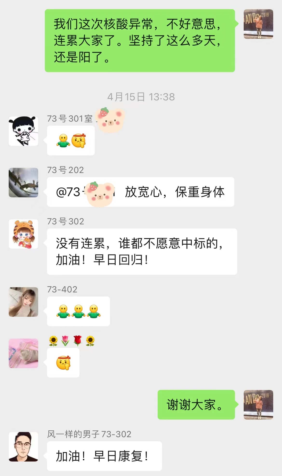 301室迅速跟了一個加油的表情。202室說,放寬心,保重身體。302室說,沒有連累,誰都不愿意中招,加油,早日回歸!201室說,別想那么多,加油,早日康復……