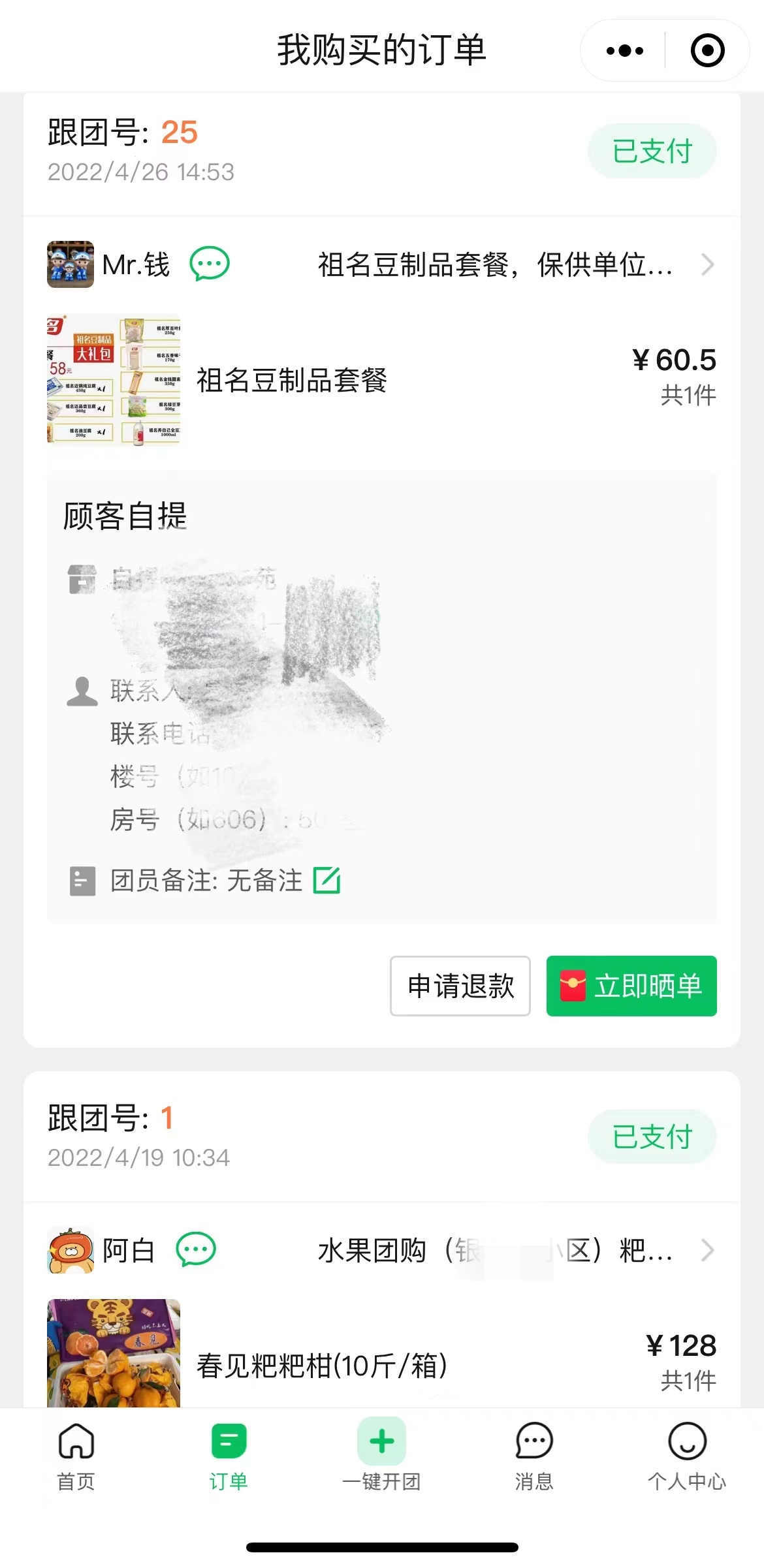隨著物資的逐漸消耗,我也開始跟團、接龍,相繼購買了蘋果、雞蛋、豬肉、豆制品、耙耙柑、蔬菜包甚至小蛋糕,并隨時關注團長們的動態。這期間,我們一家依然足不出戶,嚴格執行7天健康監測管理。