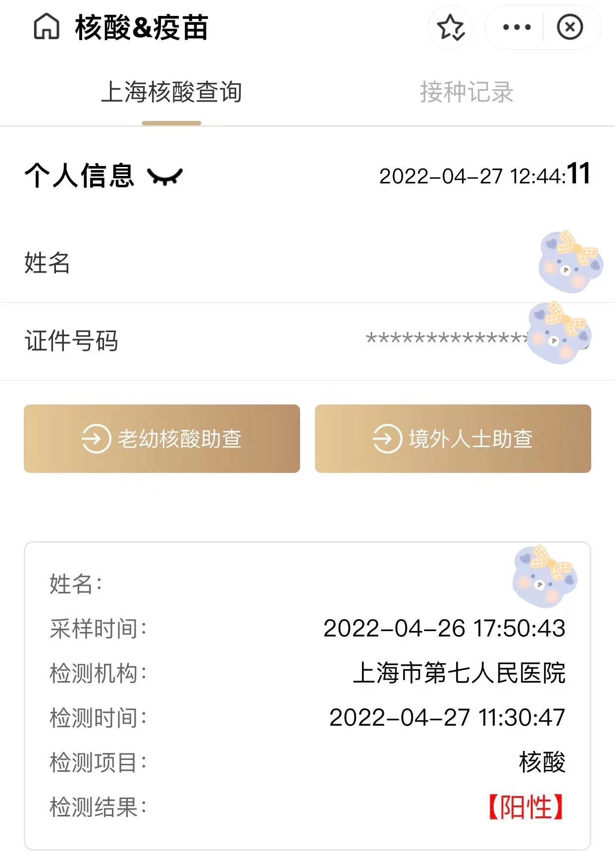 4月27日,母親出艙后的首次核酸結果出來了,確實是“陽”性?吹浇Y果后,她沉默了很久。我們也不知所措,都是第一次面對如此狡猾的病毒,誰也不知道“復陽”后會怎樣,會不會再次轉運。