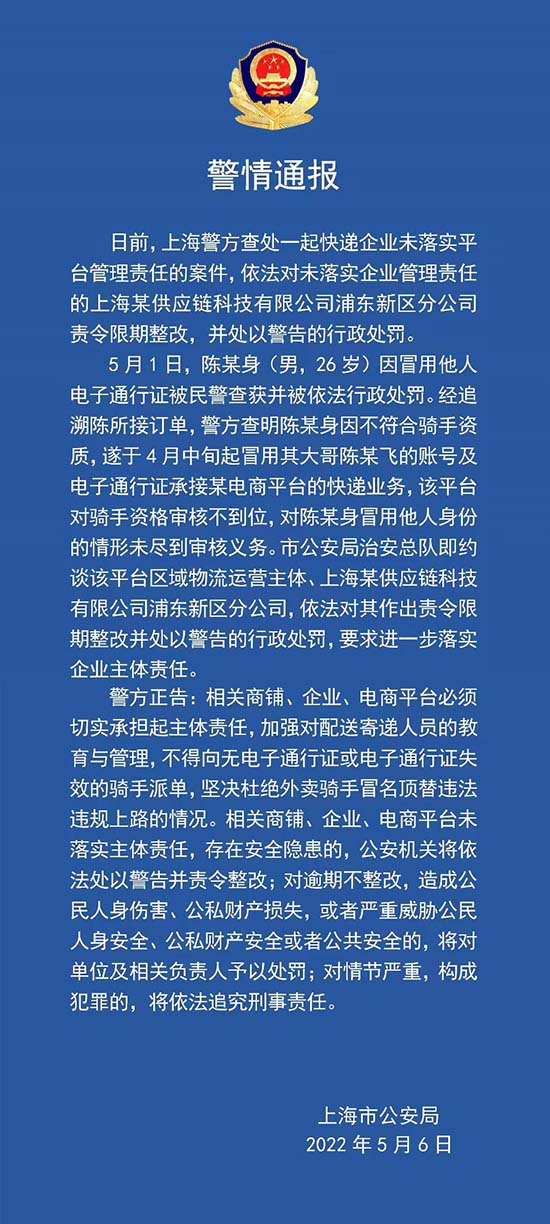 5月1日,陳某身(男,26歲)因冒用他人電子通行證被民警查獲并被依法行政處罰。經追溯陳所接訂單,警方查明陳某身因不符合騎手資質,遂于4月中旬起冒用其大哥陳某飛的賬號及電子通行證承接某電商平臺的快遞業務,該平臺對騎手資格審核不到位,對陳某身冒用他人身份的情形未盡到審核義務。市公安局治安總隊即約談該平臺區域物流運營主體、上海某供應鏈科技有限公司浦東新區分公司,依法對其作出責令限期整改并處以警告的行政處罰,要求進一步落實企業主體責任。