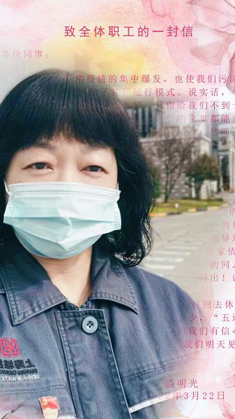 “大家有任何困難都可以找我,我作為黨支部書記,絕對不會比你們任何人先撤退!敝駡@污泥廠黨支部書記潘明光是18家污水廠里年級最大的女性書記,還有18個月即將退休。面對職工長時間駐廠的不安情緒,她親筆寫下“家書”給職工最安心的承諾:“他有他的戰場,我有我的崗位,我們一起守‘滬’!薄拔蚁肓粼谶@里,這是我一輩子工作的地方!薄