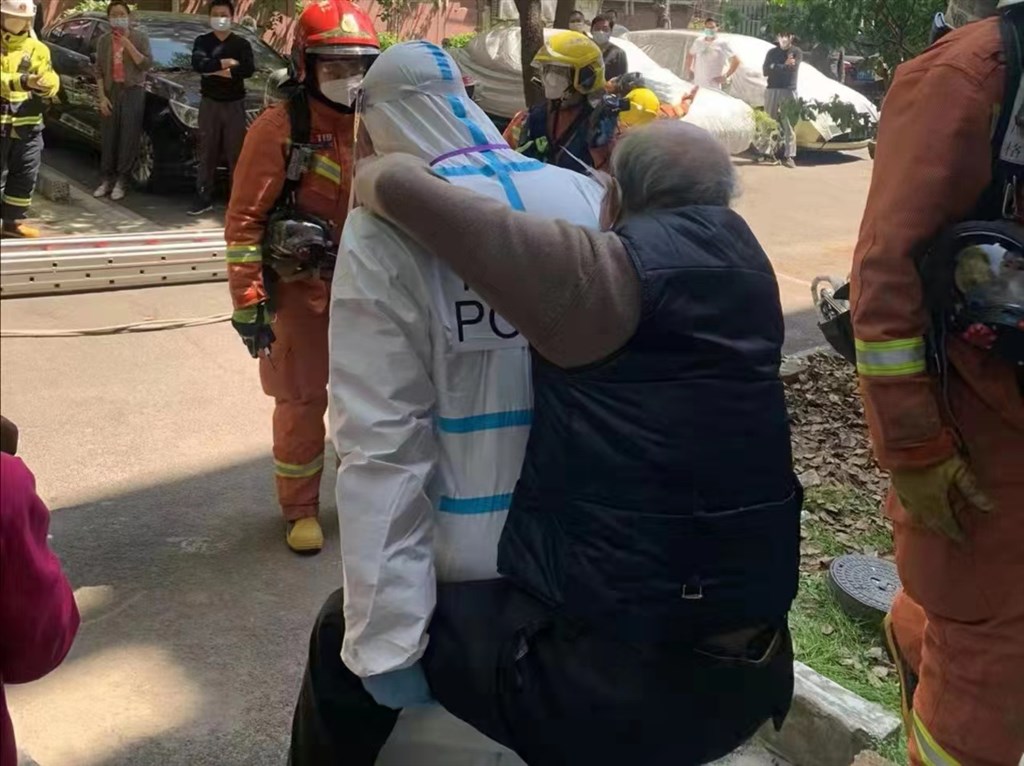 見老伯拄著拐杖行動緩慢,56歲社區民警張錫珍馬上背起94歲的老伯快速下樓,一直將老伯送到安全地點,安頓好兩位老人后,民警又再次進入現場,繼續疏散工作。