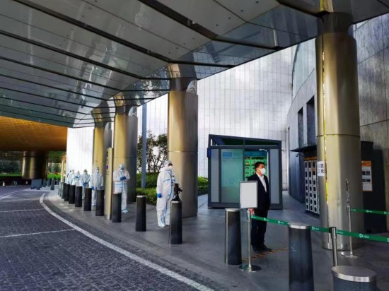 上海中心提前與大廈內保供商業租戶宣傳防疫要求,對企業提出的物資進場、垃圾清運、員工進出等需求事項逐條研究對策,在達到防疫標準的前提下盡可能滿足需求。積極落實防疫要求,在大廈主要出入口張貼“場所碼”,添購部署15套“數字哨兵”。圍繞人流、物流、車流等重點內容,提前發放復工復產告知書,詳細說明相關防疫政策。