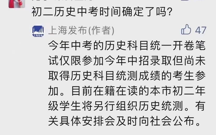 原標題:上海初二歷史中考時間確定了嗎?上海發布回應