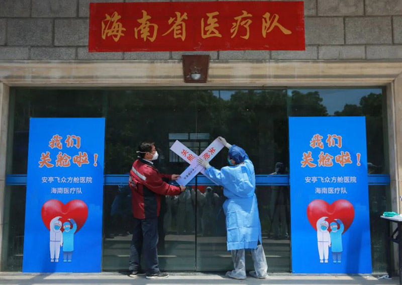 5月4日中午,嘉定安亭飛眾方艙醫院最后一批26位解除隔離醫學觀察人員出艙。隨后,醫療隊員進行環境消殺、物資清點搬運,在大門上貼上封條。至此,這個由海南省醫療隊接管的方艙醫院使命完成,正式關艙。