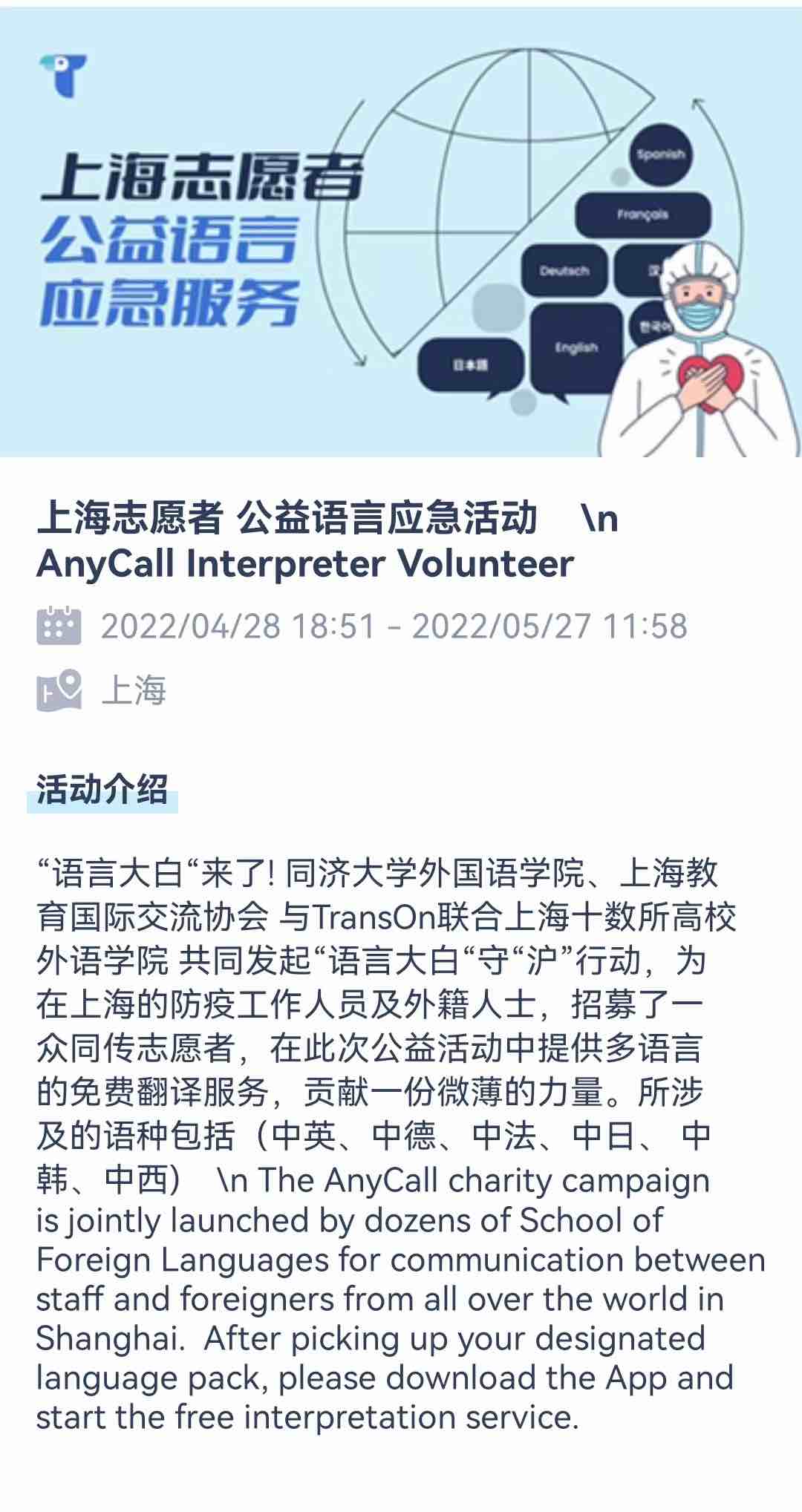 近日,一場主題為“語言大白守‘滬’行動”的外語志愿者公益服務在全市范圍內正式啟動。這一公益服務由云同傳平臺Trans On、同濟大學外國語學院、上海教育國際交流協會牽頭,聯合上海17所高等院校的外國語學院和高級翻譯學院共同發起,發動上千名外語專業人士通過Trans On云平臺快速注冊成為志愿者,提供無接觸式的“云端”即時翻譯服務,服務語種包括英語、德語、法語、日語、韓語和西班牙語等,幫助外籍人士和防疫工作人員解決溝通中的語言難題。