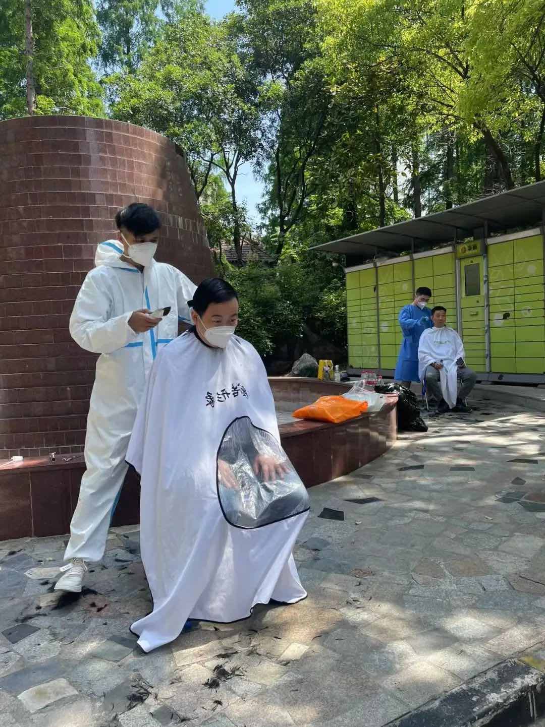 在現場,還有兩位女“Tony”!霸谖覀兝戆l志愿者中,有專業的也有業余的,還有‘重操舊業’的!敝驹刚咴S小姐介紹,雖然自己此前沒有做過理發的工作,但在居民微信溝通群里看到幫助鄰居理發的消息,想到家中也有理發工具,她便主動報名,希望能貢獻一份力量。